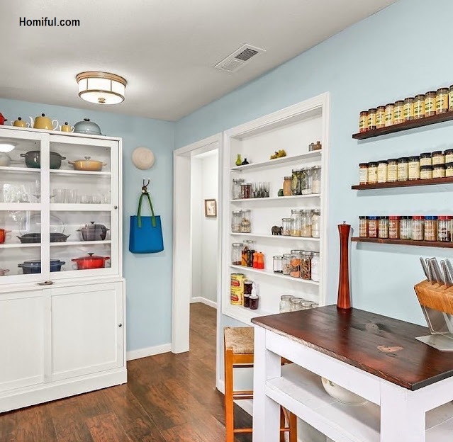 Merge the dining room with a pantry for efficient design in this tiny house. The pantry uses a built-in cabinet or a combination of open and closet racks, which will help you to have neatly dining room.