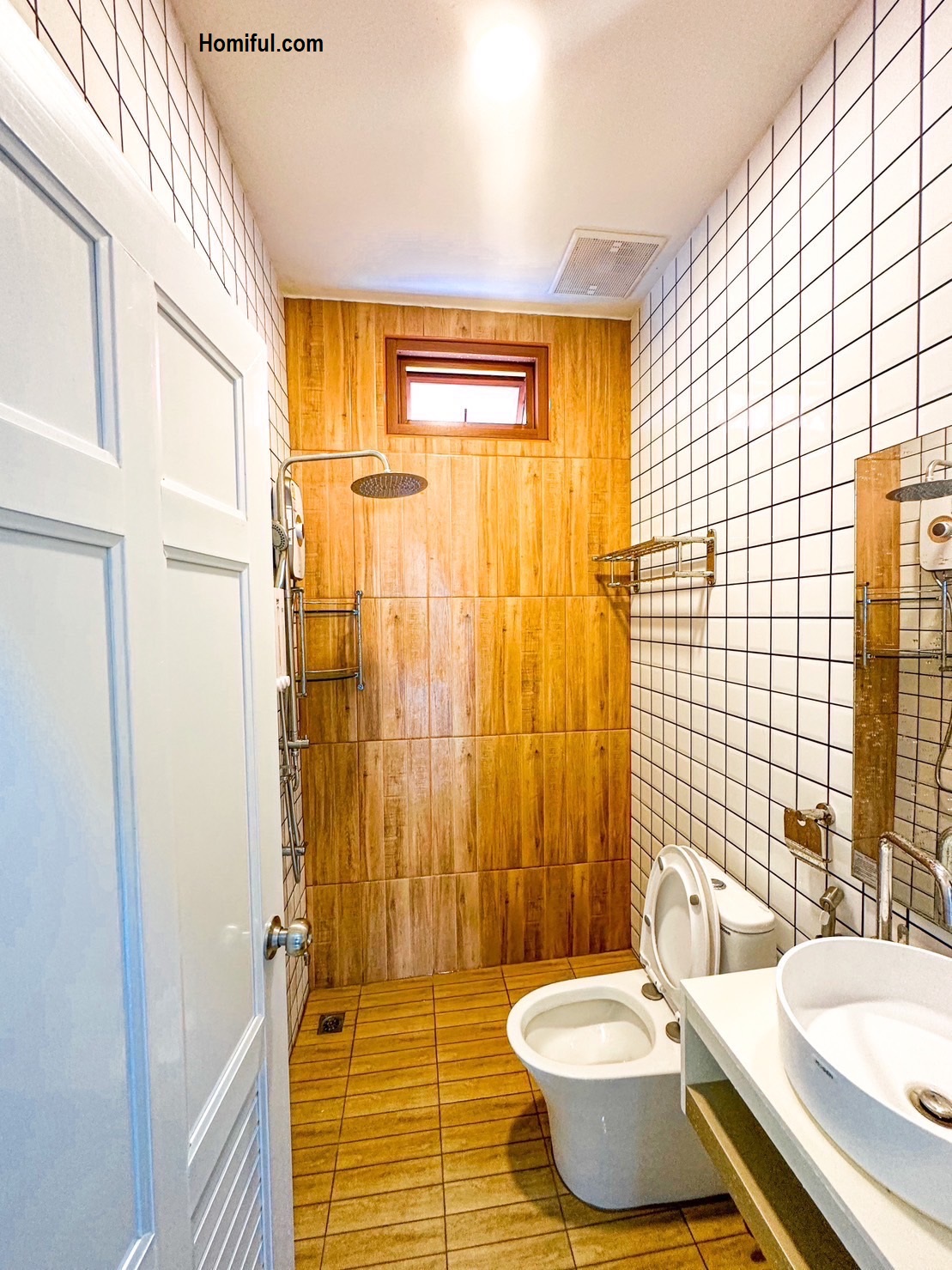 The combination of white hues and wood material always brings a warm and amazing feeling. Especially in the bathroom, you can apply them for a pretty and cozy private room. Use waterproof wood material to make a durable and also strong bathroom design.
